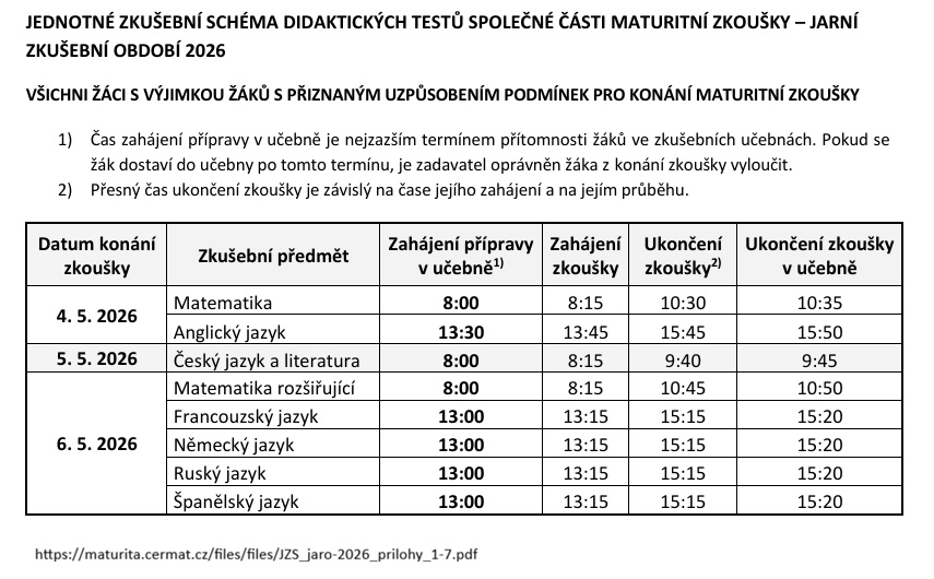 TERMÍNY MATURITNÍCH ZKOUŠEK – školní rok 2025/2026